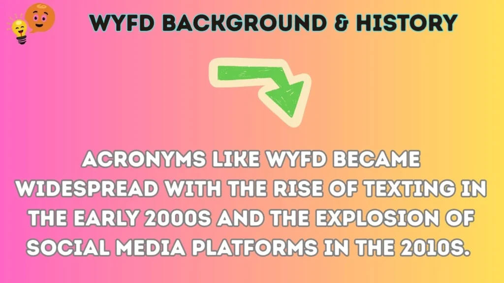 Acronyms like WYFD became widespread with the rise of texting in the early 2000s and the explosion of social media platforms in the 2010s. People began seeking efficient ways to communicate without typing long sentences. WYFD likely originated from chatrooms, messaging apps, and forums where users prioritized brevity and speed.